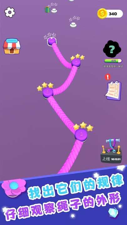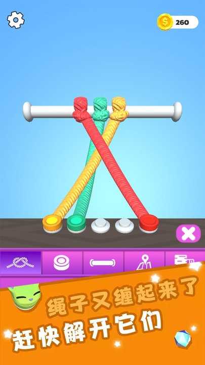 游戏中有各种各样的绳结,每个绳结都需要不同的解决方案。玩家需要动脑筋,不断尝试解开绳结。