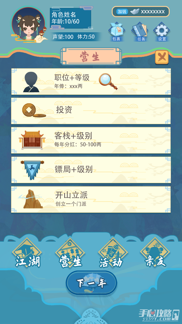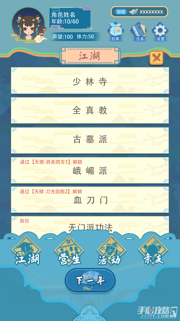 这是一款模拟经营游戏,游戏中玩家就是武侠可以自由的决定自己以后的人生道路,只要做出选择就要完成所选择道路上的任务至于什么样的任务都是去解锁完成的,只要确定收徒就得大量的招募根据所有人员当中挑选自己认为能成为武侠的小人。