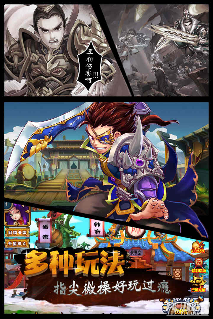 1、游戏采用精美的画面设计,在游戏中玩家将体验到三国世界的无限精彩,各种各样的三国故事和内容为你还原,玩家在这里将体验到和三国武将同场竞技的快感