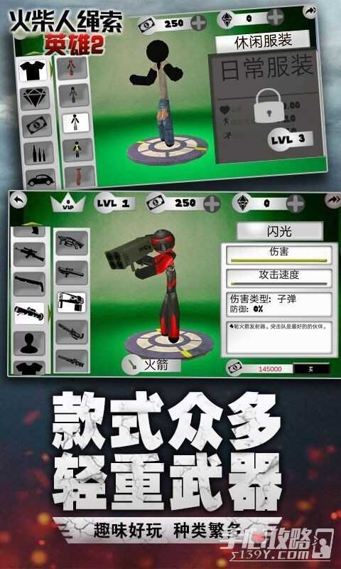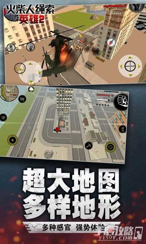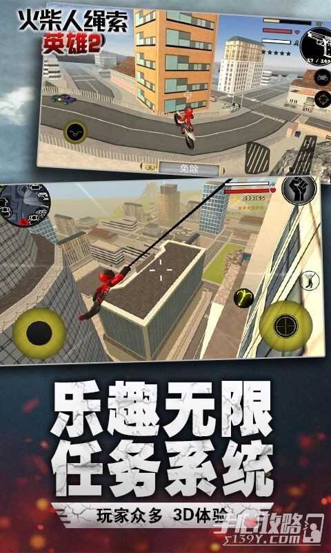 2、火柴人绳索英雄2旧版版,内置无限的金币和资源,并且也自带中文。玩家刚进入到游戏,就能使用最强的道具和装备来武装自己, 成为最强的火柴人蜘蛛侠,在城市自由摆荡,行侠仗义打击罪恶