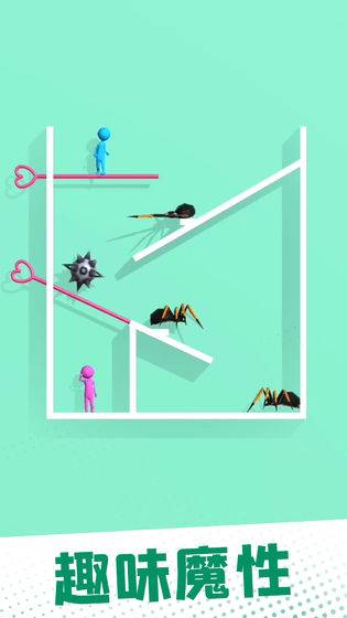 1、玩法多样独特,操作十分简单。玩家需要按正确的顺序卸下别针,避开危险的动物,让男孩女孩走到一起,这是一个既浪漫又危险的游戏,喜欢的话就下载试试吧
