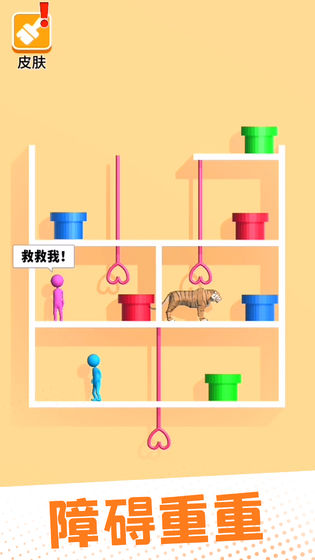 2、来解救同版的游戏哦。在这里用关卡的形式,将男女角色隔开了,然后玩家要通过移动别针,将危险阻挡,然后让两个人碰面,整个游戏画面简约,但是玩起来挺烧脑,关卡也足够多哦
