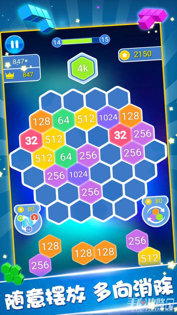 - 六边形:全方位玩法,只要是铺满整行都可消除